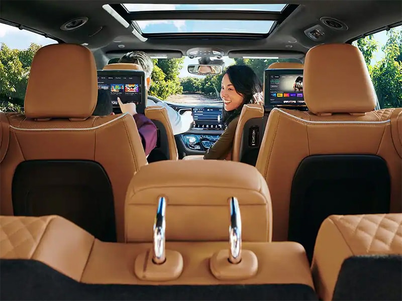 The interior of the Pacifica is luxurious, with available Nappa leather seating and room for seven. Easy Tilt Seating makes it simple for third-row passengers to enter and exit the vehicle.